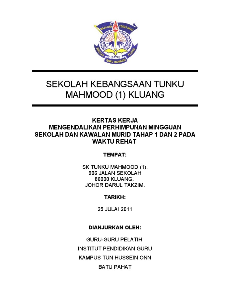 Persembahan murid semasa perhimpunan mingguan Bil Minggu Tarikh Nama Persembahan Kelas Tahun Guru Pembimbing 1 M-10 332014 Sajak MBM 6 Pintar En. 800 pagi 805 pagi Tempat. Dato abdul rahman yassin 86000 kluang johor darul takzim kertas kerja membina dewan terbuka sk abdul rahman yassin kluang johor darul takzim.